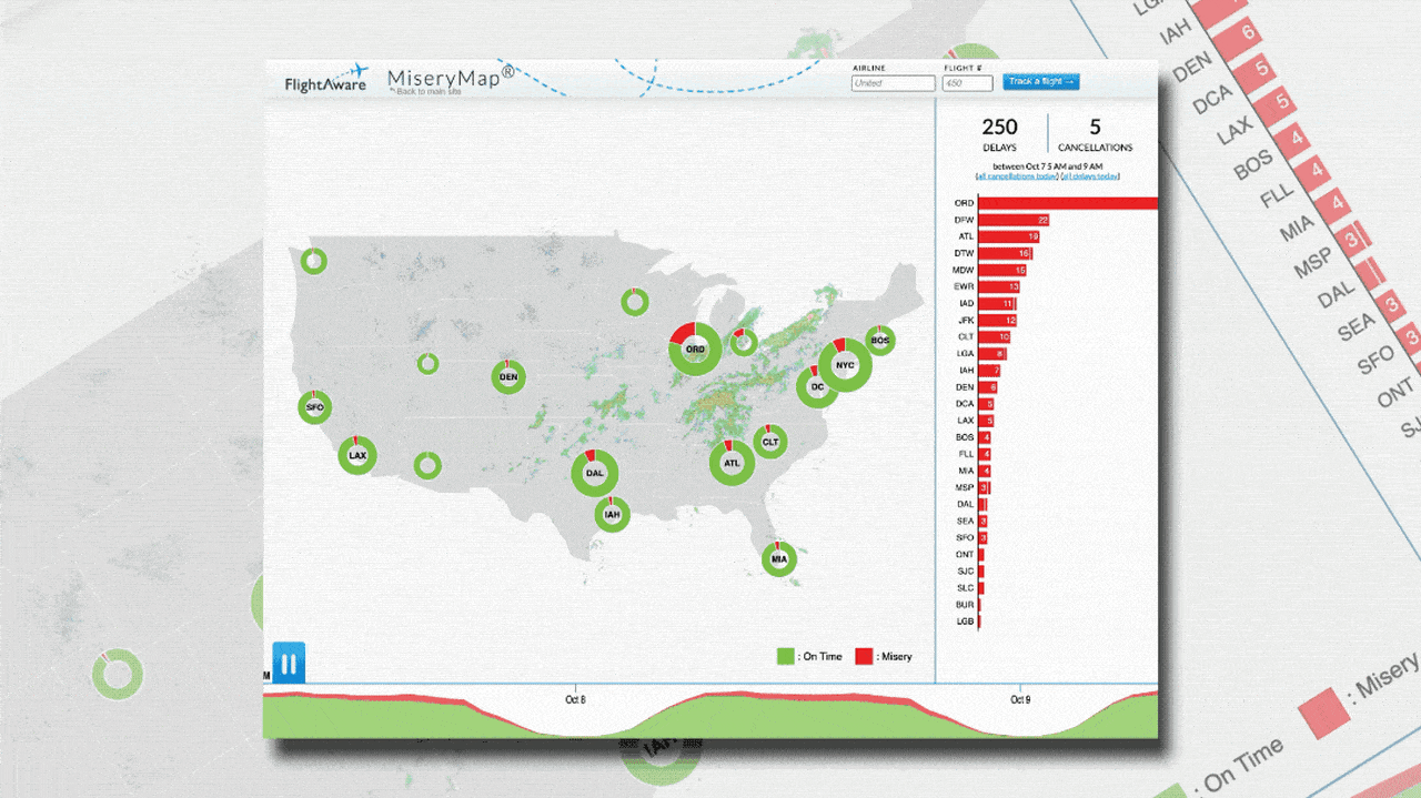 The beauty of the Misery Map is in its simplicity. According to this tool, a flight can only have two states of being: “on time” or “misery.” Flights in the “on time” category are noted in green, whereas “miserable” flights are recorded in red. Each of the map’s 17 hubs includes a circular graph that’s divided into red and green chunks based on how many of its flights have proceeded according to plan for that day. At a quick glance, the map dilutes the complicated flight landscape to help travelers understand their odds of a pain-free travel experience at any given time.