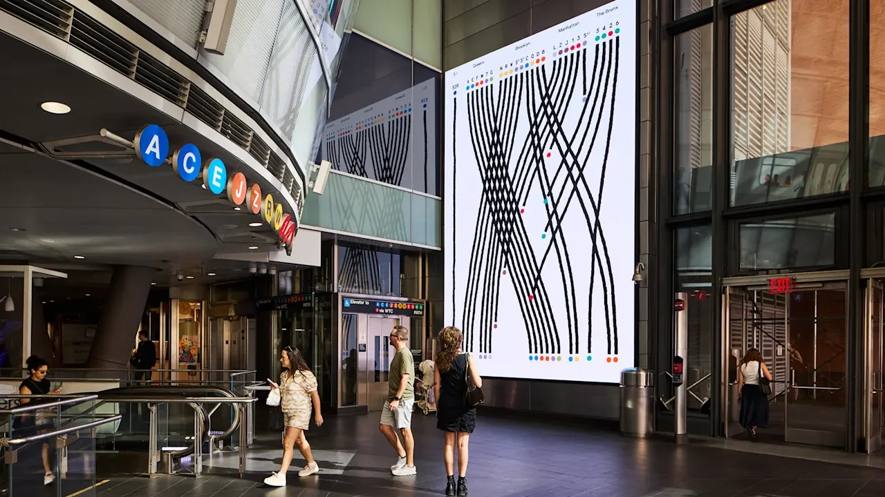 Its 25 lines, 472 stations, and 665 miles of track traverse the city and offer a tremendous amount of mobility. And now, a new digital installation at the Fulton Street subway station by the information designer Giorgia Lupi and her team at Pentagram pays tribute to the system.